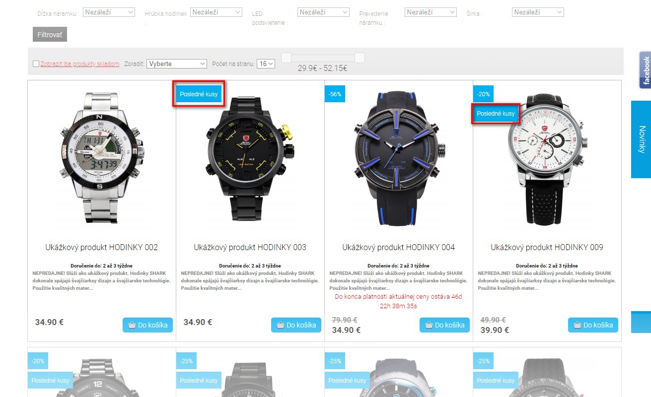 Keď budete využívať sklad e-shopu, jednou z automatických funkcií je aj definovanie hranice počtu kusov, po ktorej prekročení sa pri produkte bude v katalógu zobrazovať ikona Posledné kusy. Táto vie v zákazníkovi prebudiť záujem o objednávku (neváhať s kúpou).  Dá sa aktivovať aj ručne (ak napr. nepoužívate sklad).